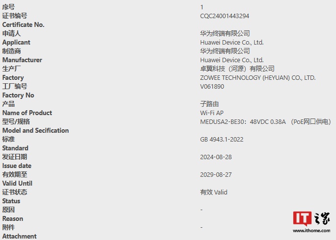 CQC 认证信息显示,路由“MEDUSA2-BE30”由 PoE 网口供电,功率为 48VDC 0.38A,其生产厂是卓翼科技(河源)有限公司。