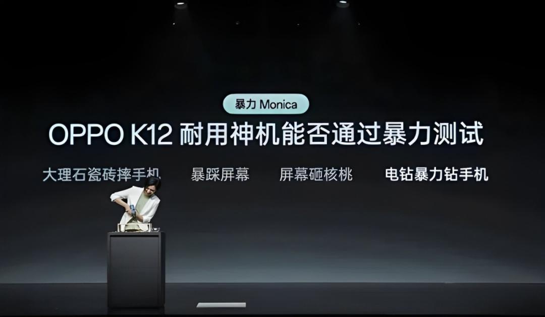 作为一款中端机,OPPO K12在产品发布会上也遭受了各种吓人测试。女神产品经理Monica化身"虐机狂魔",高度1.5米狠摔大理石地面、高跟鞋暴力踩踏屏幕,甚至拿起砸核桃、电钻钻机身...