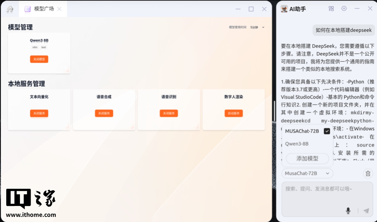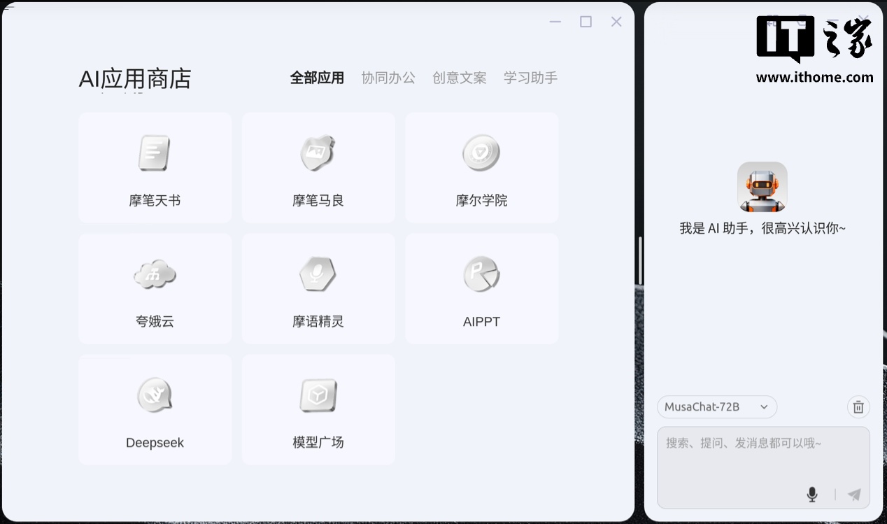 作为强调 AI 赋能的操作系统,AI OS 中自然少不了时下最热门的 AI 助手,系统自带的 AI 助手无需配置,打开即可使用,默认采用 MusaChat-72B 模型。
