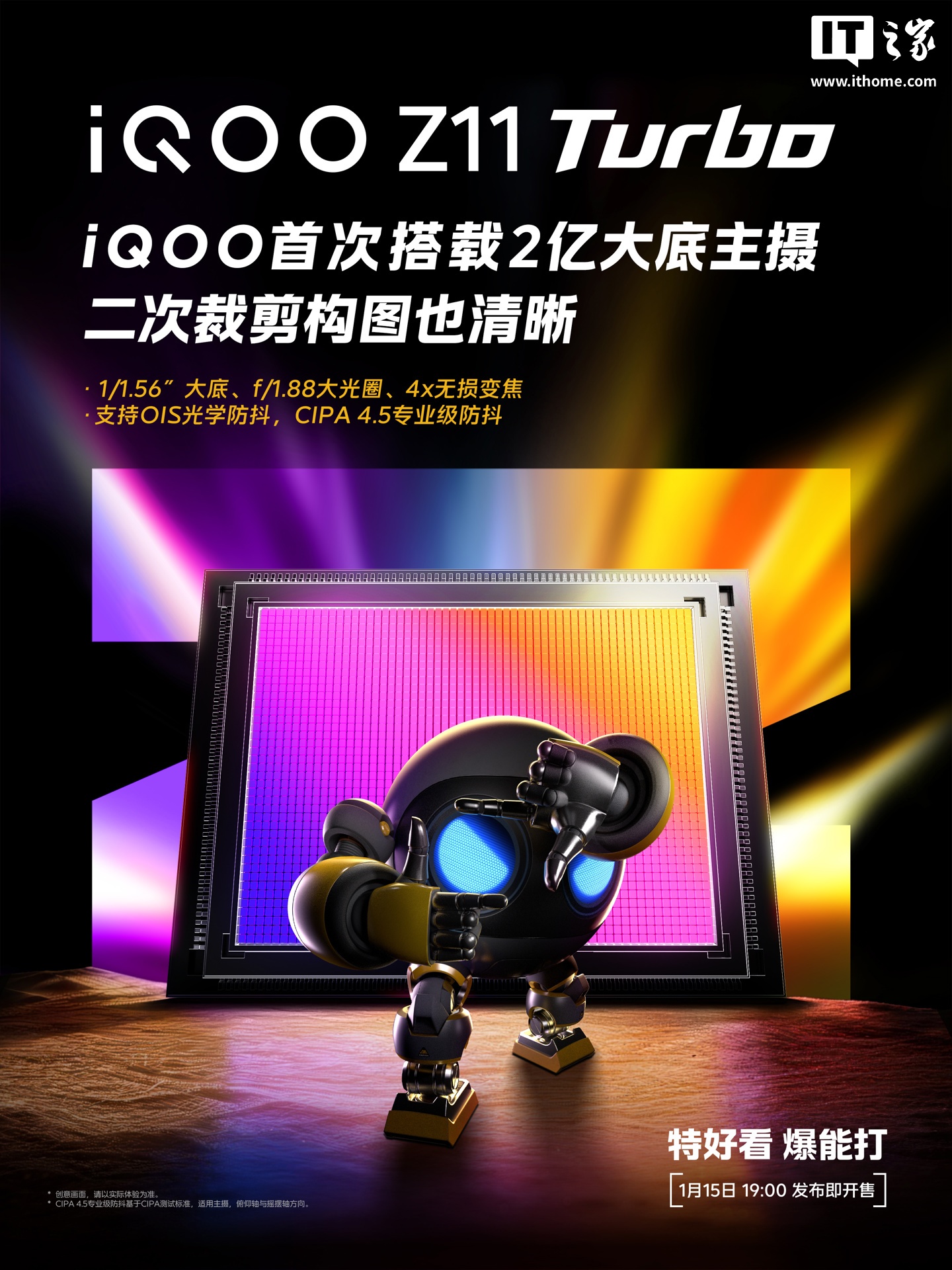 IT之家 1 月 12 日消息,iQOO 手机官方今日宣布,iQOO Z11 Turbo 将“iQOO 首次”搭载 2 亿大底超级主摄,支持 4 倍无损变焦、CIPA 4.5 专业级防抖。