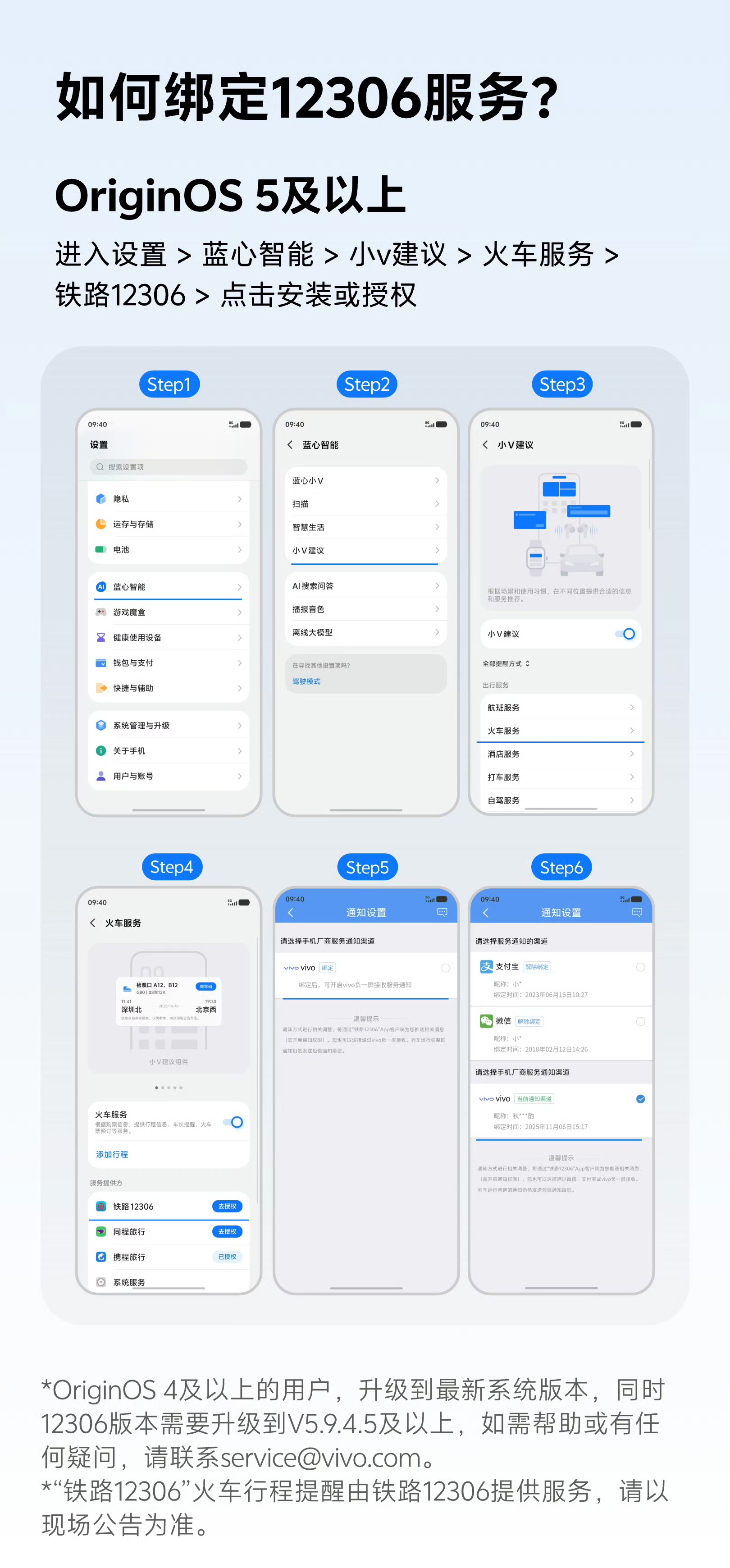 OriginOS 5 及以上:进入设置 > 蓝心智能 > 小 v 建议 > 火车服务 > 铁路 12306 > 点击安装或授权