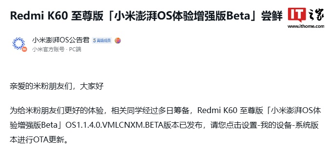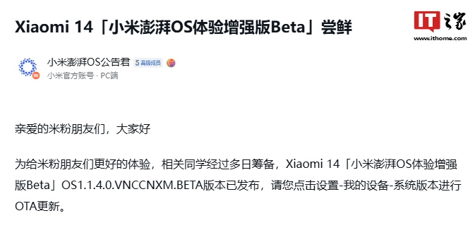 IT之家 9 月 30 日消息,小米昨晚(9 月 29 日)发布公告,小米 14、Redmi K60 至尊版“小米澎湃 OS 体验增强版 Beta OS”1.1.4.0.VNCCNXM.BETA / 1.1.4.0.VMLCNXM.BETA 版本已发布。
