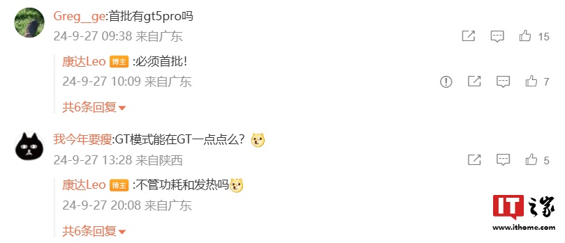 IT之家注意到,康达在自己评论区与用户展开互动:针对用户提问“首批有 GT 5 Pro 吗”,他回复称“必须首批”;针对 GT5 Pro 机型实况拍照功能上线时间,他表示“6.0”。
