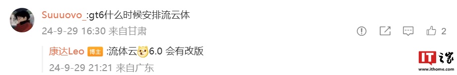 此外,在康达昨日发布的微博评论区下,还有用户提问“GT 6 什么时候安排流体云”,他回复称“流体云 6.0 会有改版”