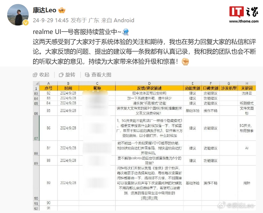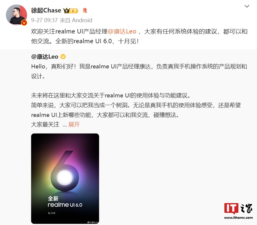 IT之家 9 月 30 日消息,真我副总裁、全球营销总裁、中国区总裁徐起 9 月 27 日发文称,全新的 realme UI 6.0 十月见。同时 realme UI 产品经理 @康达 Leo 微博账号已经上线,其负责真我手机操作系统的产品规划和设计。