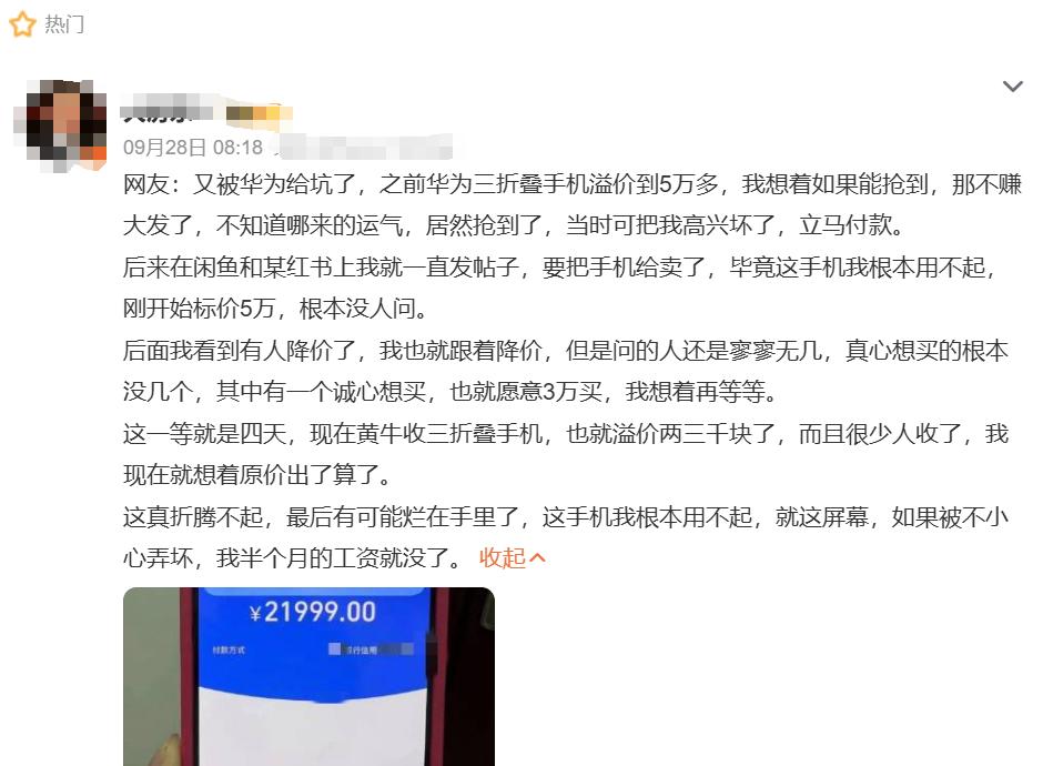 而半个月过去了,目前关于这款三折叠溢价的消息也有更新,不少消息指出,华为三折叠手机黄牛价暴跌。