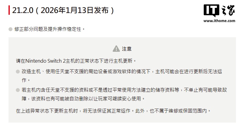 IT之家注意到,任天堂还提醒 Nintendo Switch 2 非正常主机在更新后可能会陷入异常状态,无法保证其在更新后正常运行,且此类主机也不覆盖在保修范围内。