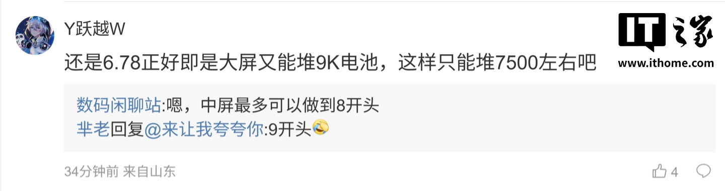 后续有用户在评论区询问:“三星屏幕么”,博主回复道:“国产屏”;另一名用户则询问道:“还是 6.78 正好即是大屏又能堆 9K 电池,这样只能堆 7500 左右吧”,博主则回复道:“嗯,中屏最多可以做到 8 开头”。