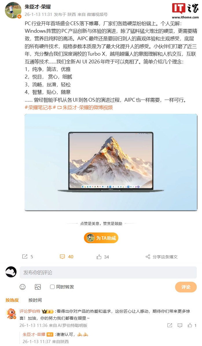 IT之家 1 月 13 日消息,荣耀终端股份有限公司 PC 产品总经理 @朱臣才-荣耀 今日发布视频,展示了荣耀 PC 全新 AI UI。他表示,Windows 阵营的 PC 产品创新与体验的演进,除了猛料猛火堆出的硬菜,更需要精致,营养且纯粹的高汤。