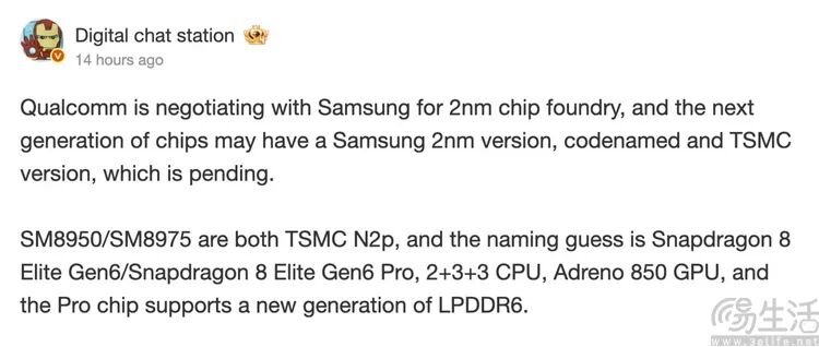 日前知名爆料者@数码闲聊站 透露,高通可能会在2026年秋季同时发布两款旗舰SoC。它们的内部代号分别为“SM8950”和“SM8975”,而“商品名”则可能被称作第六代骁龙8至尊版和第六代骁龙8至尊版Pro。