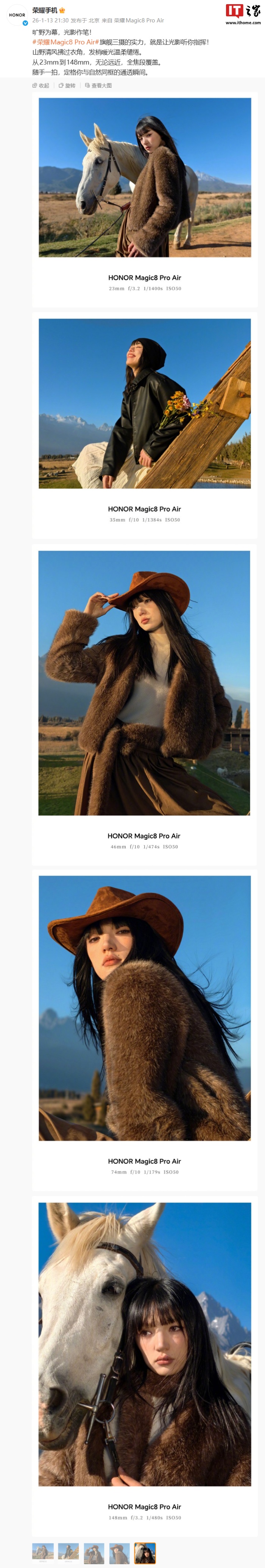 IT之家 1 月 13 日消息,荣耀手机官方今日公布了 Magic8 Pro Air 的拍摄样张,宣称新机“从 23mm 到 148mm,无论远近,全焦段覆盖”。