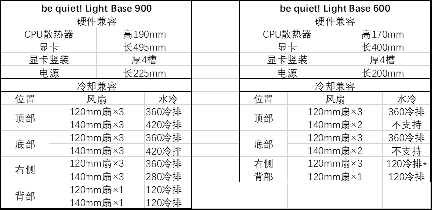 be quiet! Light Base 600 本体体积 59.7L,支持到 ATX 主板,拥有 7 条扩展槽,Light Base 900 额外支持 E-ATX、XL-ATX 主板且配备 8 条扩展槽,体积也增加到 80.9L。