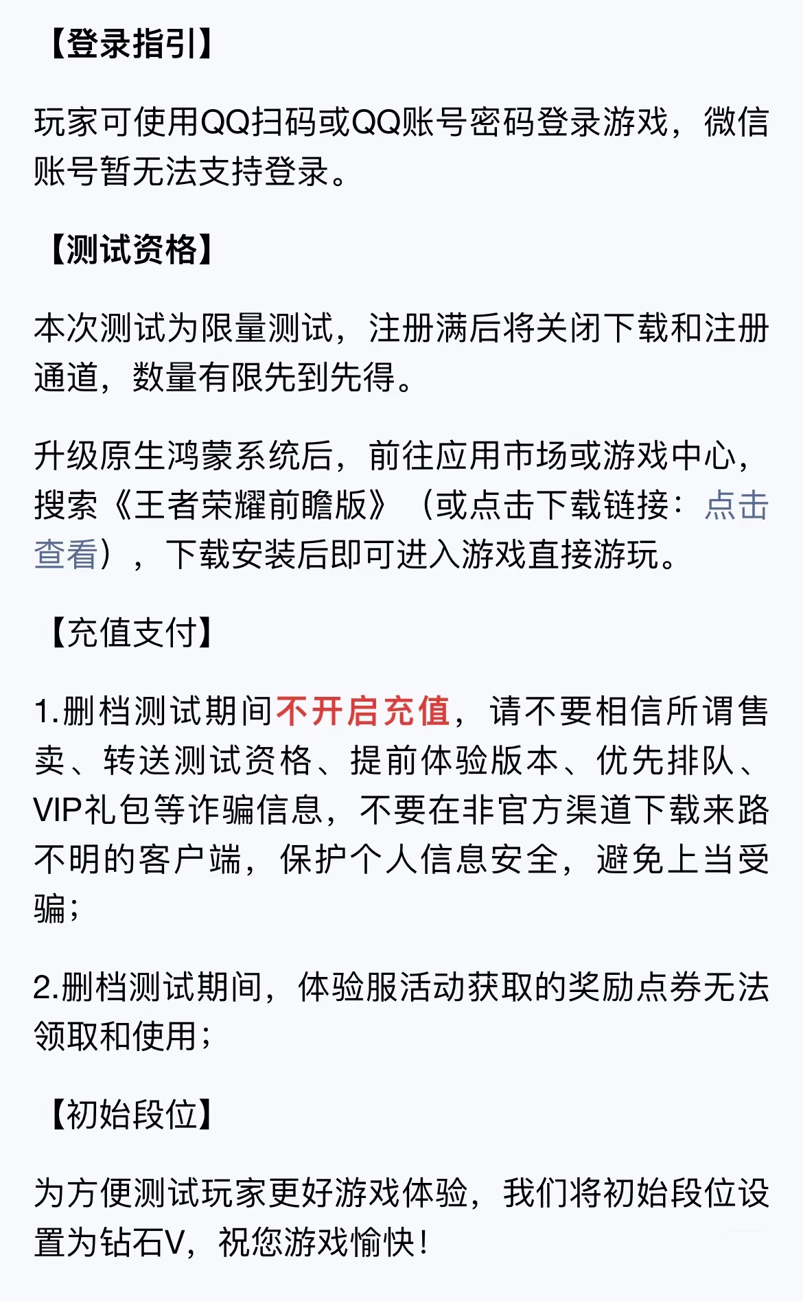 1、删档测试期间不开启充值,请不要相信所谓售卖、转送测试资格、提前体验版本、优先排队、VIP 礼包等诈骗信息,不要在非官方渠道下载来路不明的客户端,保护个人信息安全,避免上当受骗;