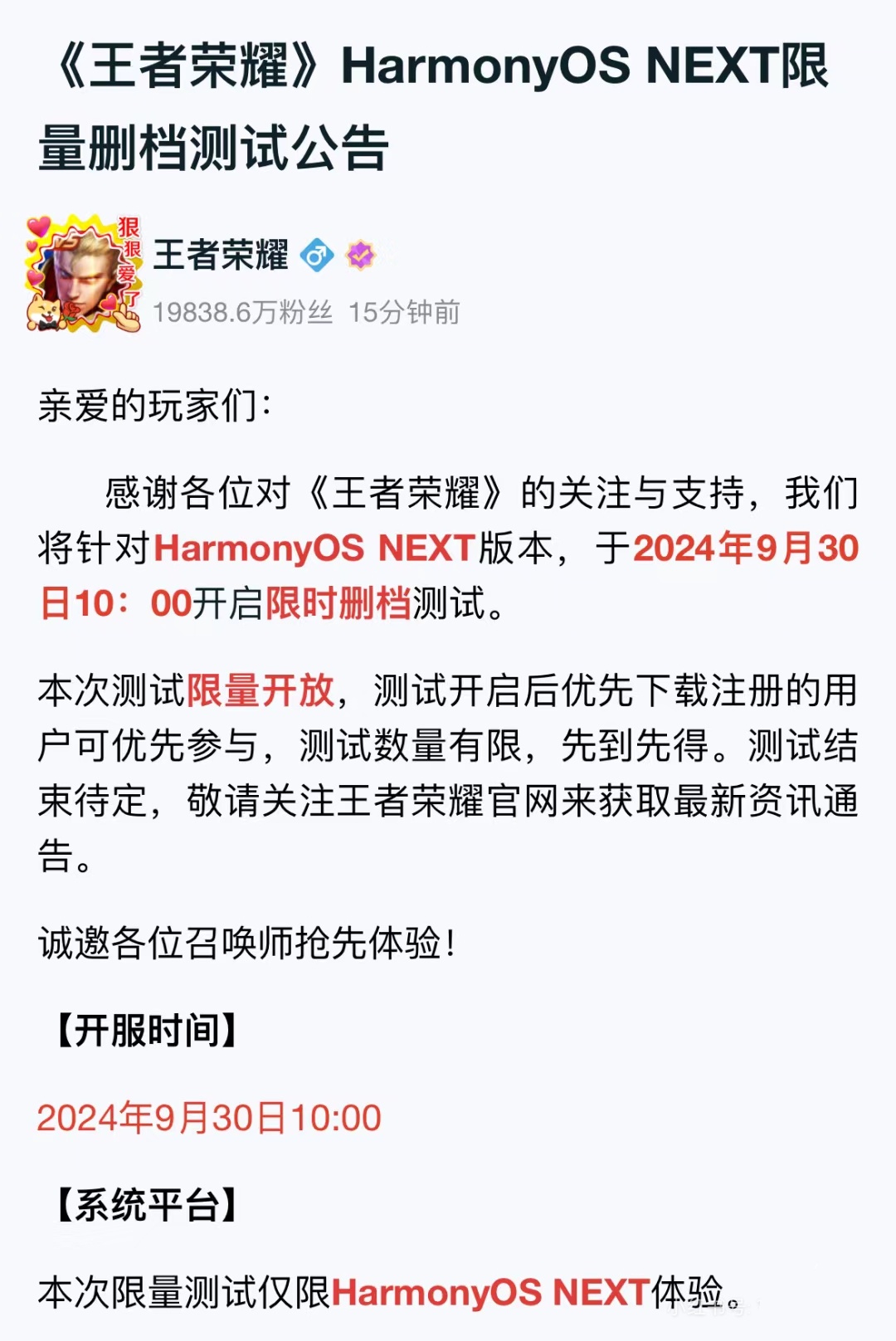 IT之家 9 月 30 日消息,腾讯《王者荣耀》手游今日官宣,将针对 HarmonyOS NEXT 版本,于 2024 年 9 月 30 日 10:00 开启限时删档测试。