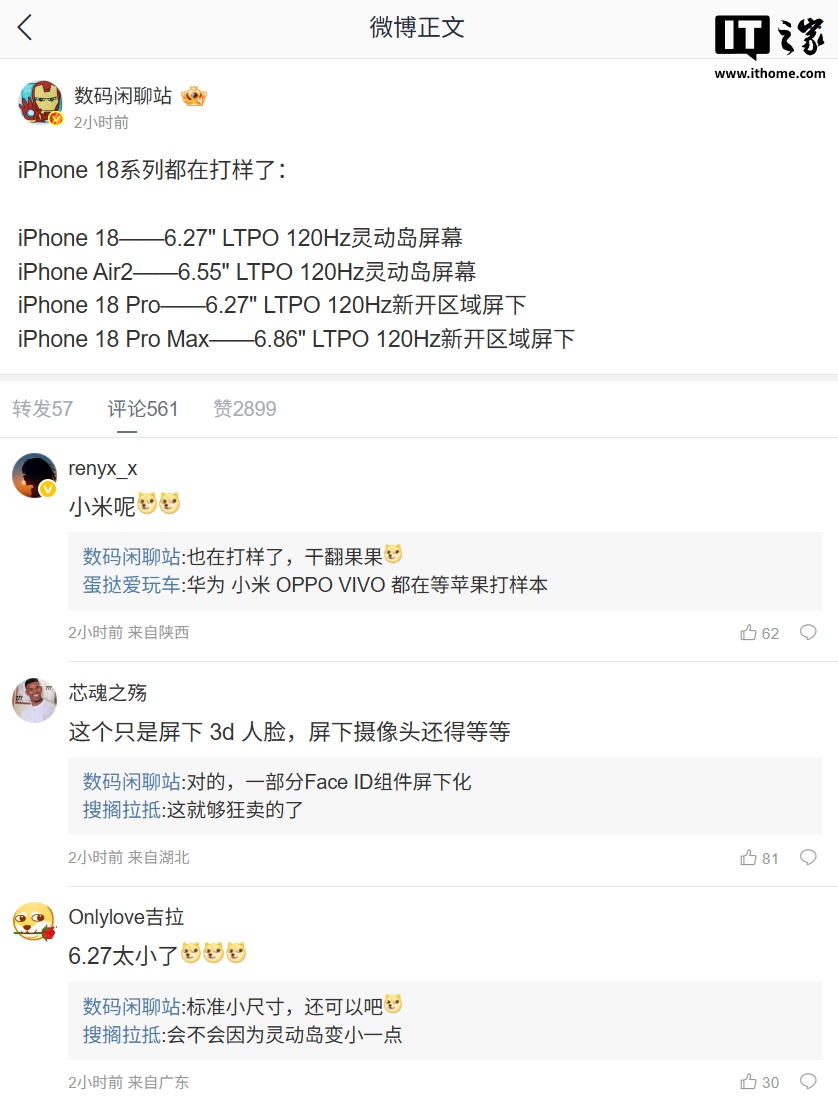 IT之家 1 月 14 日消息,博主 @数码闲聊站 今日爆料了苹果 iPhone 18 系列和 iPhone Air2 的屏幕配置:
