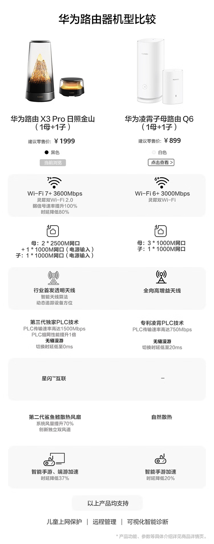 特色功能:支持日照金山灯效,PLC 3.0 组网,Wi-Fi 7+,双频无缝漫游,灵犀双 Wi-Fi,星闪网关,分段测速,鸿蒙智联及 802.11kvr 协议,PPPoE / DHCP / 静态 IP 上网方式,智能加速,IoT 专属通道,远程控制,Wi-Fi 定时开关,客人 Wi-Fi,Wi-Fi 防暴力破解,WPA3 DMZ / 虚拟服务器