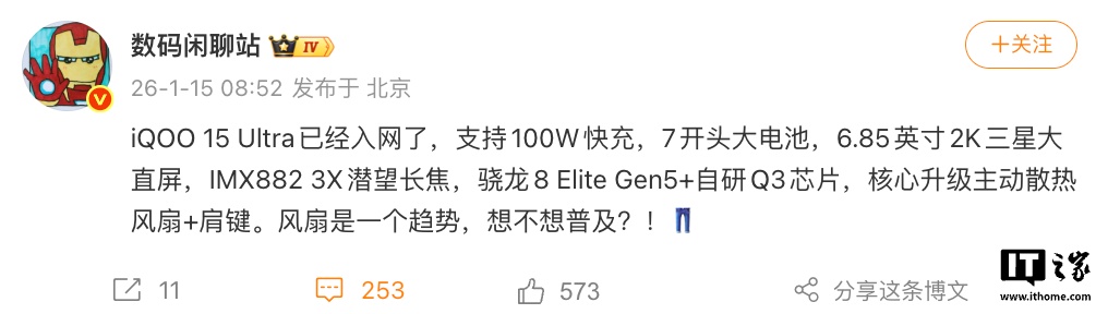 IT之家 1 月 15 日消息,维沃移动通信有限公司旗下一款新机目前已正式入网,博主 @数码闲聊站 发文,透露该机实为 iQOO 15 Ultra。