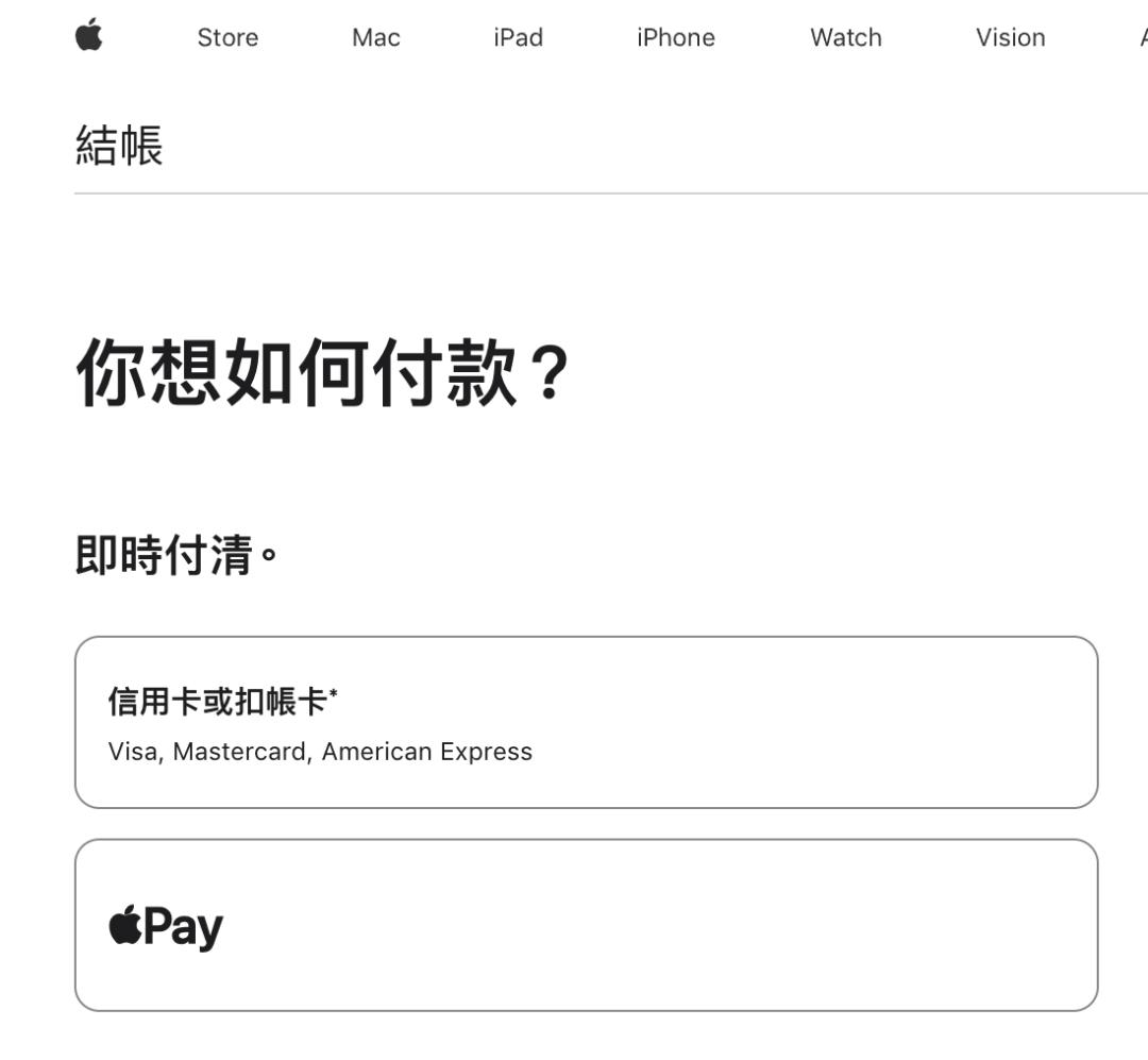 国区 Apple Pay 支持 Visa 和万事达卡之后,就能在香港官网用 Apple Pay 快捷支付了——