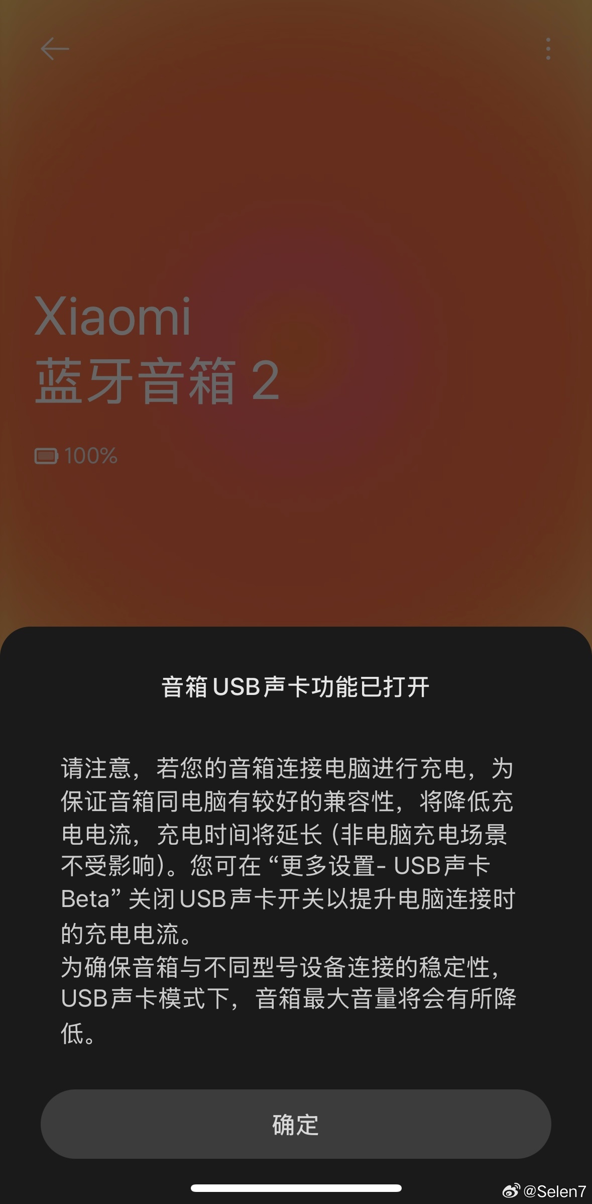 从 @Selen7 发布的功能图片来看,内测设备为“Xiaomi 蓝牙音箱 2”,功能开启后将延长设备充电时间,同时音箱最大音量将有所降低,USB 声卡功能也在设置页面有一个 Beta 开关。