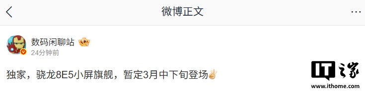IT之家 1 月 15 日消息,博主 @数码闲聊站 今日爆料称,骁龙 8E5 小屏旗舰暂定 3 月中下旬登场。结合该博主此前的爆料,新机预计为一加 15T。