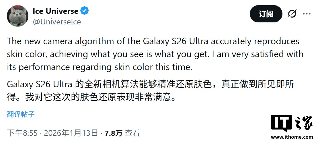 此外消息源 @UniverseIce 指出三星 Galaxy S26 Ultra 将采用全新相机算法,能够精准还原肤色,做到所见即所得。