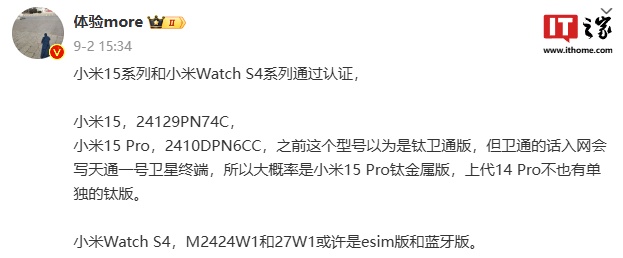 IT之家注意到,早在本月初,M2424W1 和 M2427W1 两款小米产品便通过了工信部无线电核准。据博主 @体验more 透露,这两款产品预计为小米 Watch S4 系列,区别或许是 eSIM 版和蓝牙版。