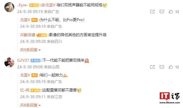 此外,@戈蓝 V 还在另一篇微博评论区下与用户展开互动:针对“双扬声器能不能同规格”,他表示“为什么不能,比 Pro 更 Pro”;针对影像方面能否联动“蔡司”,他称“一起努力”。