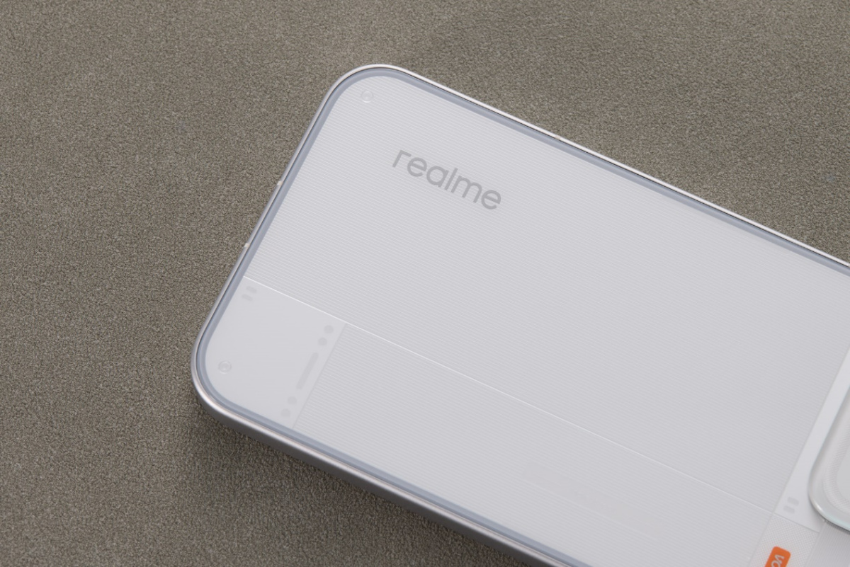 后壳下方视觉又变得克制与简洁,表面只有一个契合整体色调的 realme 字母 Logo,更多细节则隐藏在盖板下方,一道道自上而下的横纹格栅,搭配细致多样的朋克风金属装饰,还有 Make it real 个性铭牌,上手处处是惊喜。