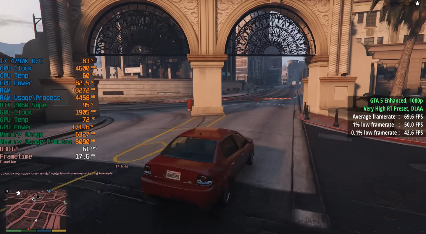 | GTA5 增强版 | 69.6 | 50 | 极高画质 + 光追,1080P,DLAA |