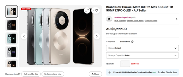 至于为啥不直接在澳洲买呢,托尼也去澳洲 eBay 上查了一下,第三方经销商 OPPO Find X9 Pro、vivo X300 Pro 、小米 17 Pro Max 报价都在 2000 澳元( 9400 人民币 )上下,一加 15 要卖到 1500 多澳元 ( 7000 人民币 ), 至于最近国内都缺货的华为 Mate 80 Pro Max ,起售价就要 2999 澳元( 14000 人民币 ),比 iPhone 17 Pro Max 贵多了。。。