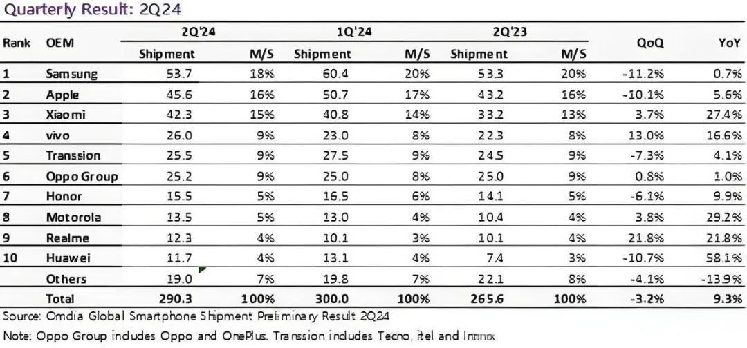 根据Omdia智能手机研究团队的最新研究,2024年第二季度全球智能手机出货量同比增长7.6%,达到2.896亿部。这已经是连续三个季度保持复苏态势。