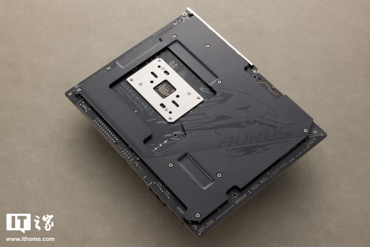主板背部覆盖大面积黑色一体式金属背板,能够保护主板和增加散热能力。