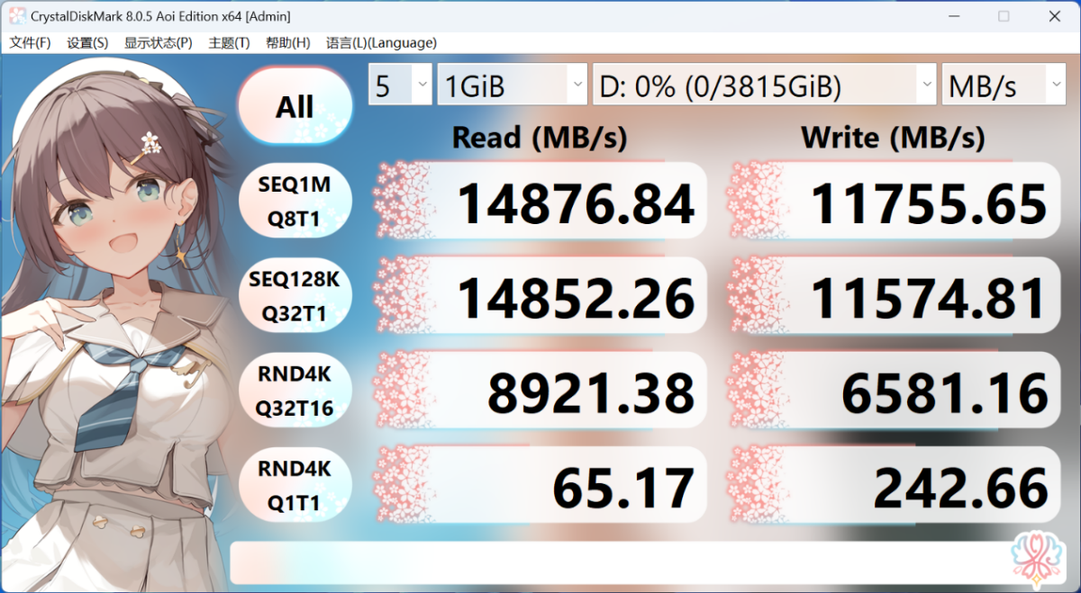 硬盘方面,技嘉 X870E X3D 电竞雕主板提供了 2 个 PCIe5.0x4 的 M.2 固态插槽,IT之家在最上面一条拥有独立散热装甲的主 M.2 固态插槽中插入 1 根 PCIe Gen5 规格的旗舰固态硬盘,官方宣称其支持最大 14000MB/s 的读取速度,经过实测,硬盘的顺序读取速度达到了 14876MB/s,写入速度也有 11755MB/s,完全可以发挥出这块硬盘的应有实力。