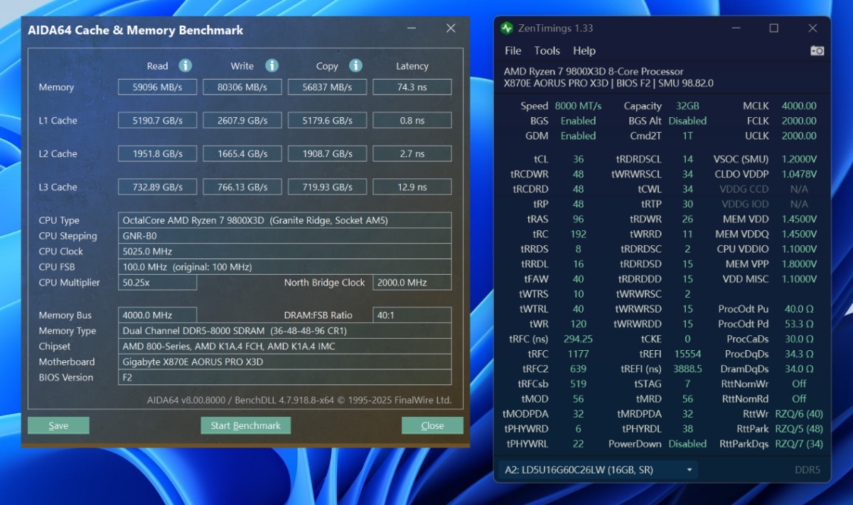 事实证明,只要内存条的颗粒和体质到位,技嘉 X870E X3D 电竞雕主板能够轻松将 6000MHz 的内存条超频到 8000MHz 超高频率,超频实力有目共睹。不过从 AIDA64 的跑分结果上看,其成绩并不如同步 6000MHz 的 AI 超频表现,这里并不鼓励大家进行异步超频,直接保持在 6000MHz 的最佳内存频率上就好。