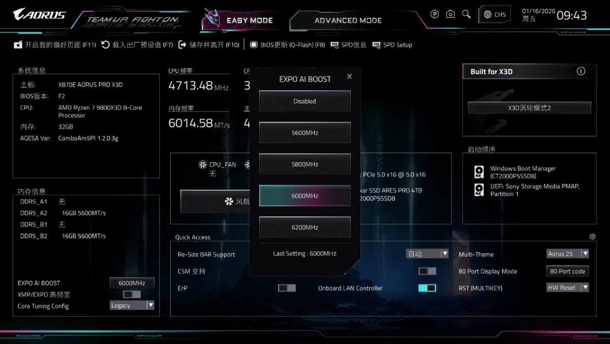 内存方面,技嘉 X870E X3D 电竞雕主板可以支持 9000+MT/s 的超高内存频率,虽然 AMD 平台 CPU 的内存频率“甜蜜点”只有 6000MHz,但我们还是会通过分频异步模式,考验一下它的超频实力如何。