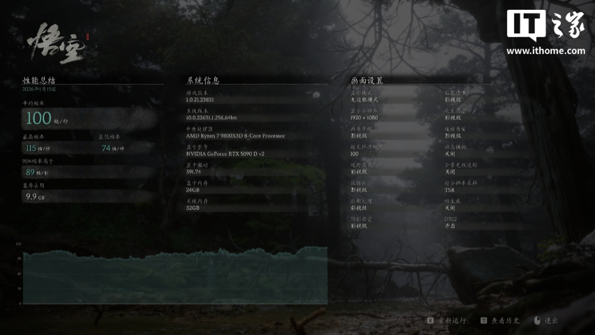 锐龙 7 9800X3D 在「极限游戏」模式下游戏平均帧数为 109 帧,1% Low 为 89 帧;