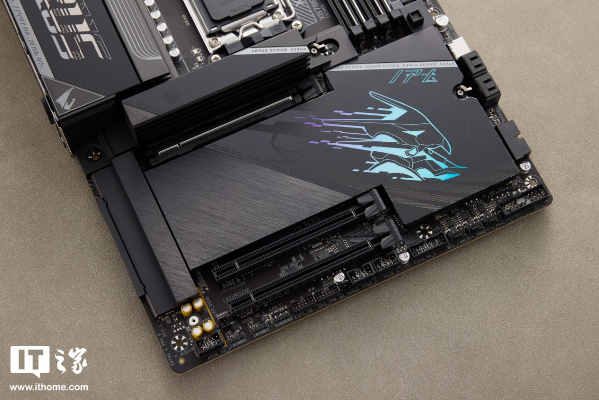 作为价格更加亲民的 X870 旗舰平台,技嘉 X870E X3D 电竞雕主板延续了标志性的暗黑风涂装,搭配深灰色的拉丝质感金属散热装甲,视觉张力很强。