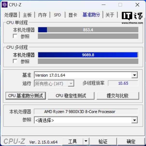 锐龙 7 9800X3D 在「标准」模式下单线程得分 853 分,多线程得分 9089 分;