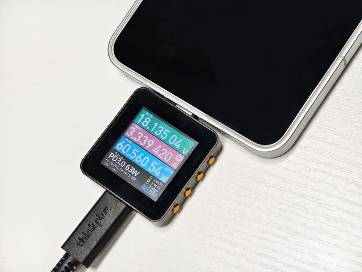 首先,在 iPhone 15 Pro Max 的充电测试中,thinkplus 光影氮化镓 100W 多口充电器触发 PD 3.0 27W 充电协议,充电功率为 8.8V 2.8A 25.5W,开启 PD 快速充电模式。充电一段时间后,充电功率下降至 18W。最终会因 iPhone 电池升温,导致充电功率下降至 10W 以内。