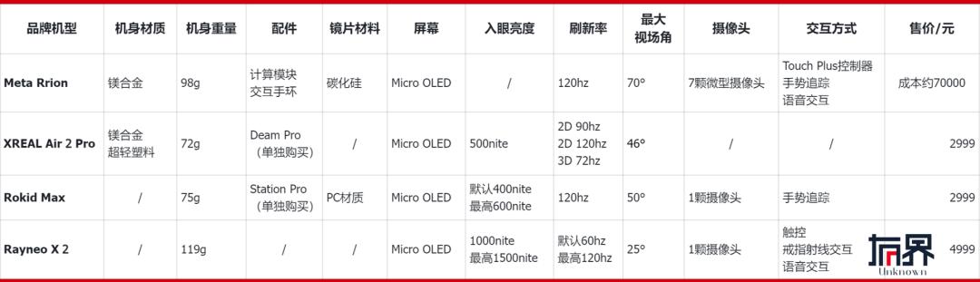 ▲ 国内主流AR产品与Meta Orion的对比,制图:有界UnKnown