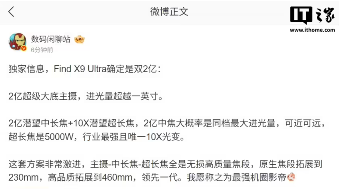 就在今天(1 月 19 日),微博博主发文透露,OV 这一代的超大杯机型将搭载双 2 亿镜头,其他家预计会在下一代跟进,形成“全员超大底 2 亿像素主摄 +2 亿长焦”格局。