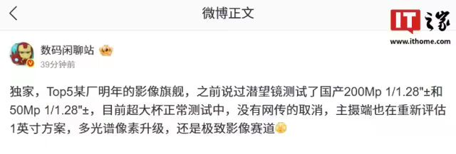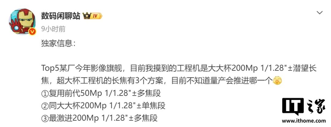 按照微博博主的说法,Top5 某厂今年影像旗舰,目前摸到的工程机是搭载 2 亿像素 1/1.28 英寸潜望长焦。
