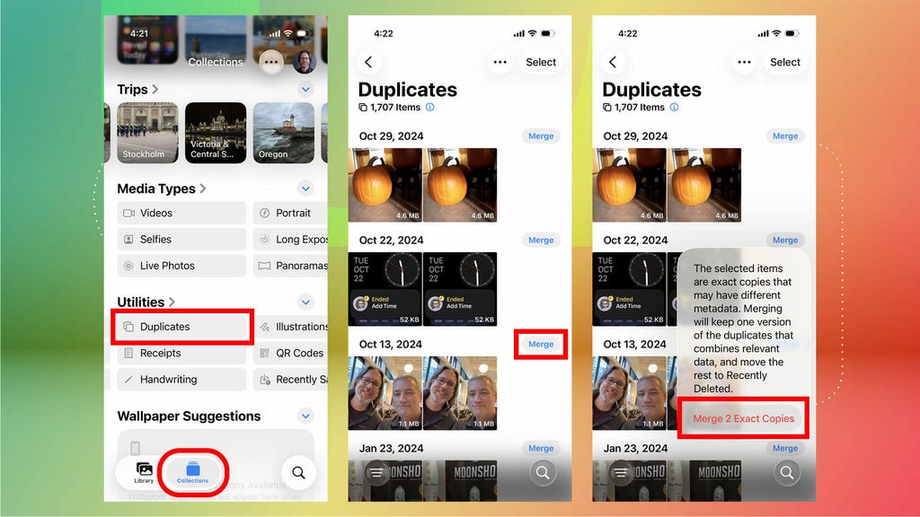 删除iPhone上的重复照片和视频,轻松获取更多存储空间(此处展示iOS 26界面)。Jeff Carlson/CNET截图