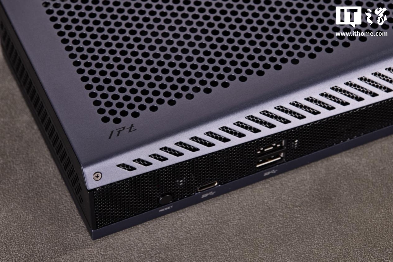 其正面搭载复位键、一个 USB-C 3.2 Gen2*2 接口以及两个 USB-A 3.2 Gen2 接口,便于快速重启或插拔常用拓展设备。