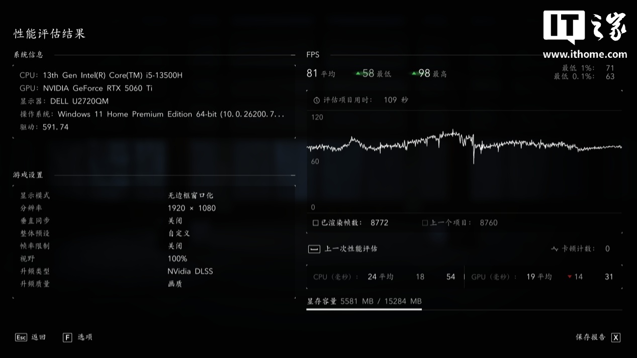 《刺客信条:影》对 CPU 和显卡的要求都很高,运行游戏自带基准测试,在 1080P 分辨率 + 全高画质 + DLSS 画质 + 帧生成下,游戏平均帧数为 81 帧,1% Low 帧 71 帧。