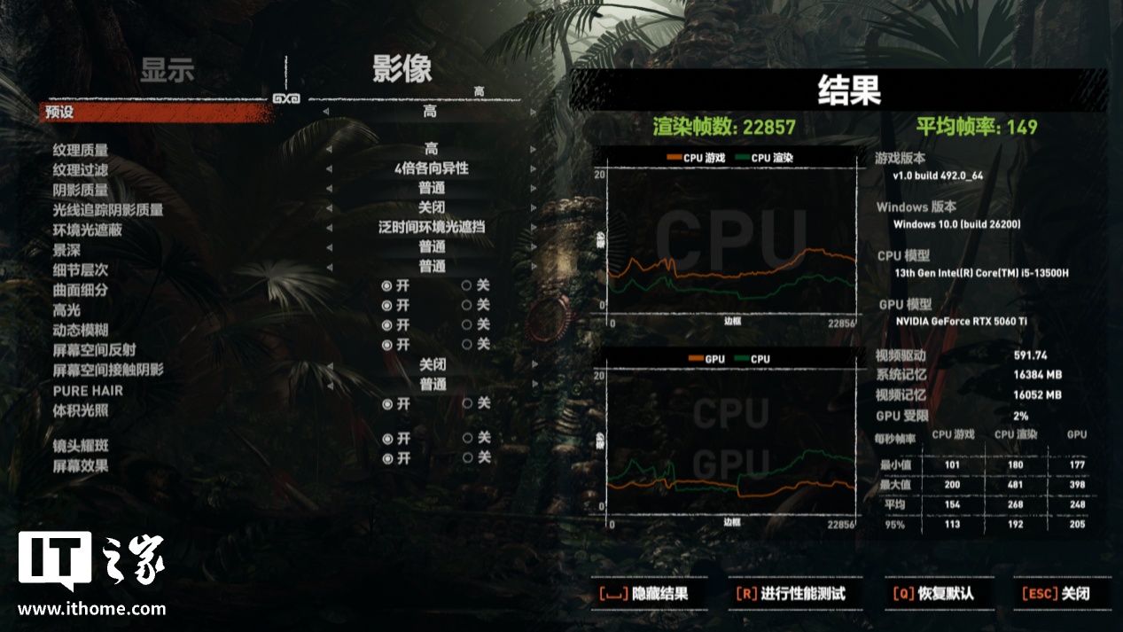 《古墓丽影:暗影》作为传统光栅游戏的代表,经过实测,RTX 5060 Ti 在 1080 分辨率 + 高画质下,游戏平均帧数 149 帧;