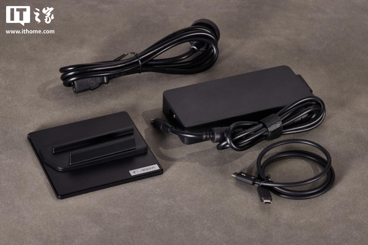 AORUS RTX 5060 Ti AI BOX 配备 330W 电源适配器、可以同时解决笔记本和拓展坞的供电,出门能少带一个笔记本的电源适配器。另外,AORUS RTX 5060 Ti AI BOX 还附送了立式底座以及一条雷电 5 传输线,无需挑选复杂线材,设备到手即可用。
