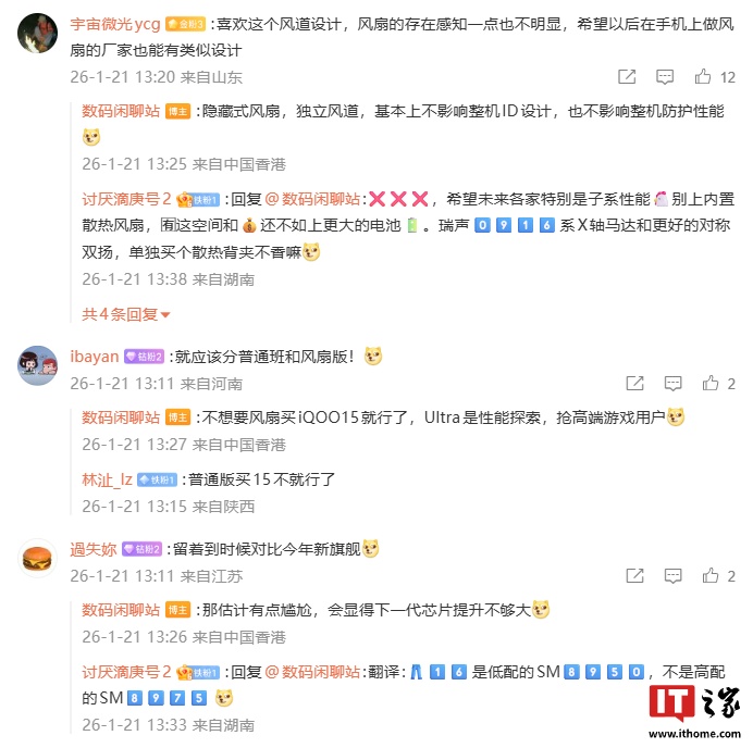 博主还在评论区回复了部分网友的问题:针对风道设计的讨论,他表示:“隐藏式风扇,独立风道,基本上不影响整机 ID 设计,也不影响整机防护性能。”针对 iQOO 15 Ultra 应该分普通版和风扇版,他回复称:“不想要风扇买 iQOO15 就行了,Ultra 是性能探索,抢高端游戏用户。”
