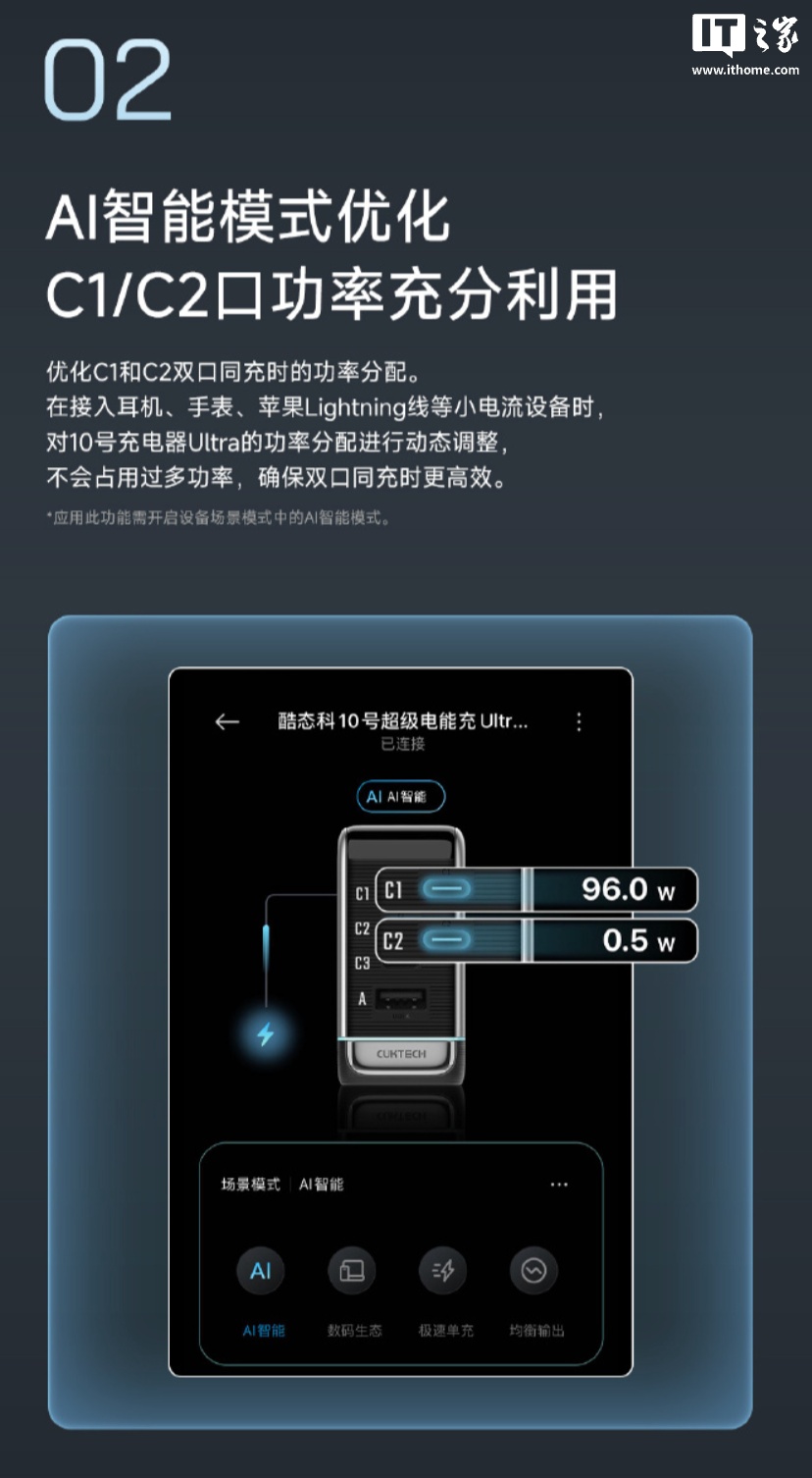 优化设备 USB-C1/C2 双口同充时的功率分配,在接入耳机、手表、苹果 Lightning 线等小电流设备时,对 10 号充电器 Ultra 的功率分配进行动态调整,不会占用过多功率,确保双口同充时更高效。