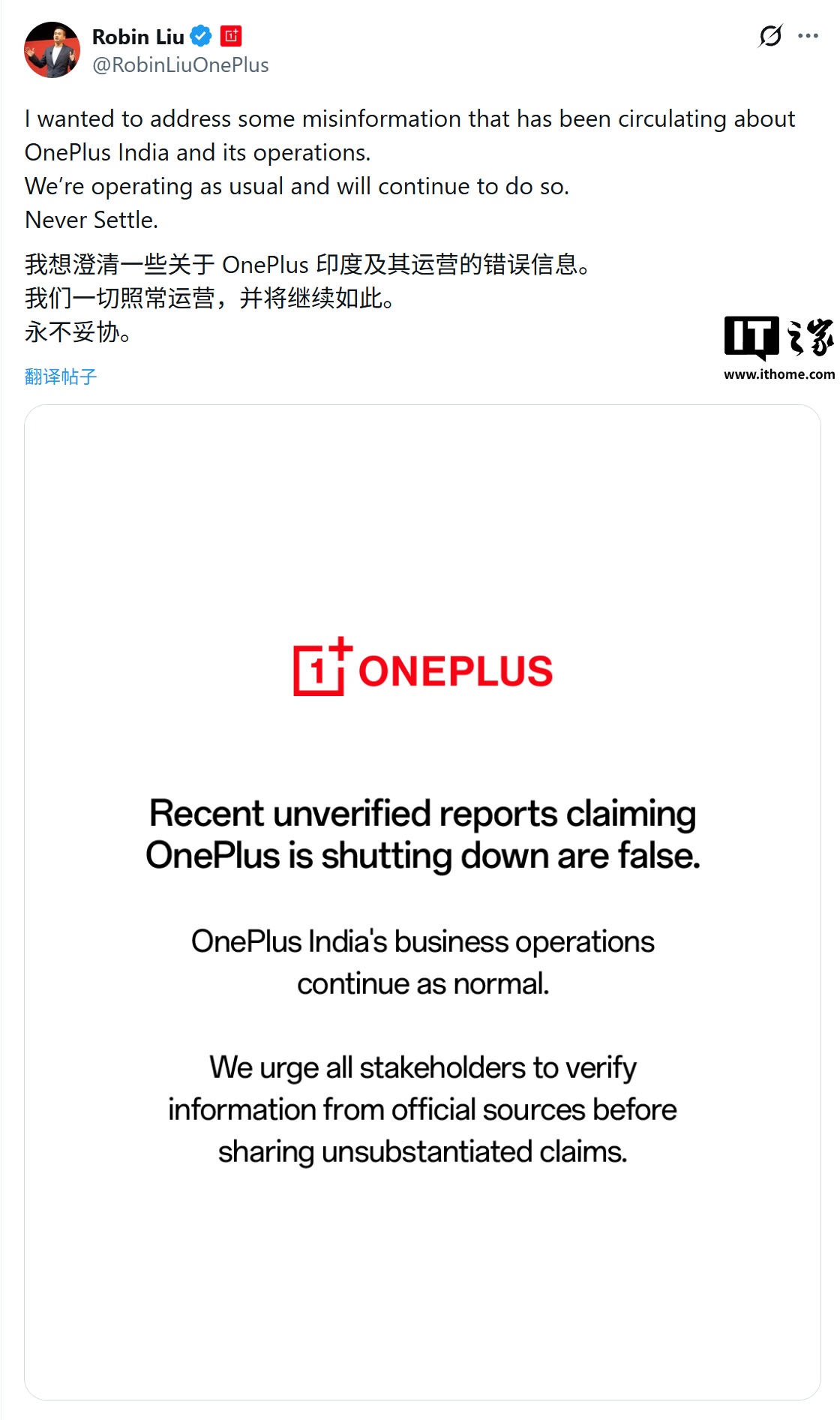 IT之家 1 月 21 日消息,一加印度首席执行官 Robin Liu 今天(1 月 21 日)通过 X 发布推文,明确指出关于一加印度公司的负面报道纯属虚假信息,公司目前并未陷入停摆危机,各项业务均在正常运转中。